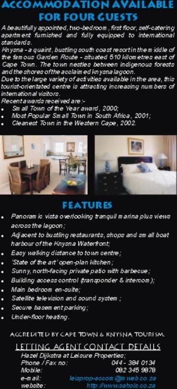 Brochure [ Home ][ Brochure ] [ Site Map ] [ Search ] [ Links ] [ Forex ] ......Officially Accredited by Knysna Tourism and Cape Town Tourism......
